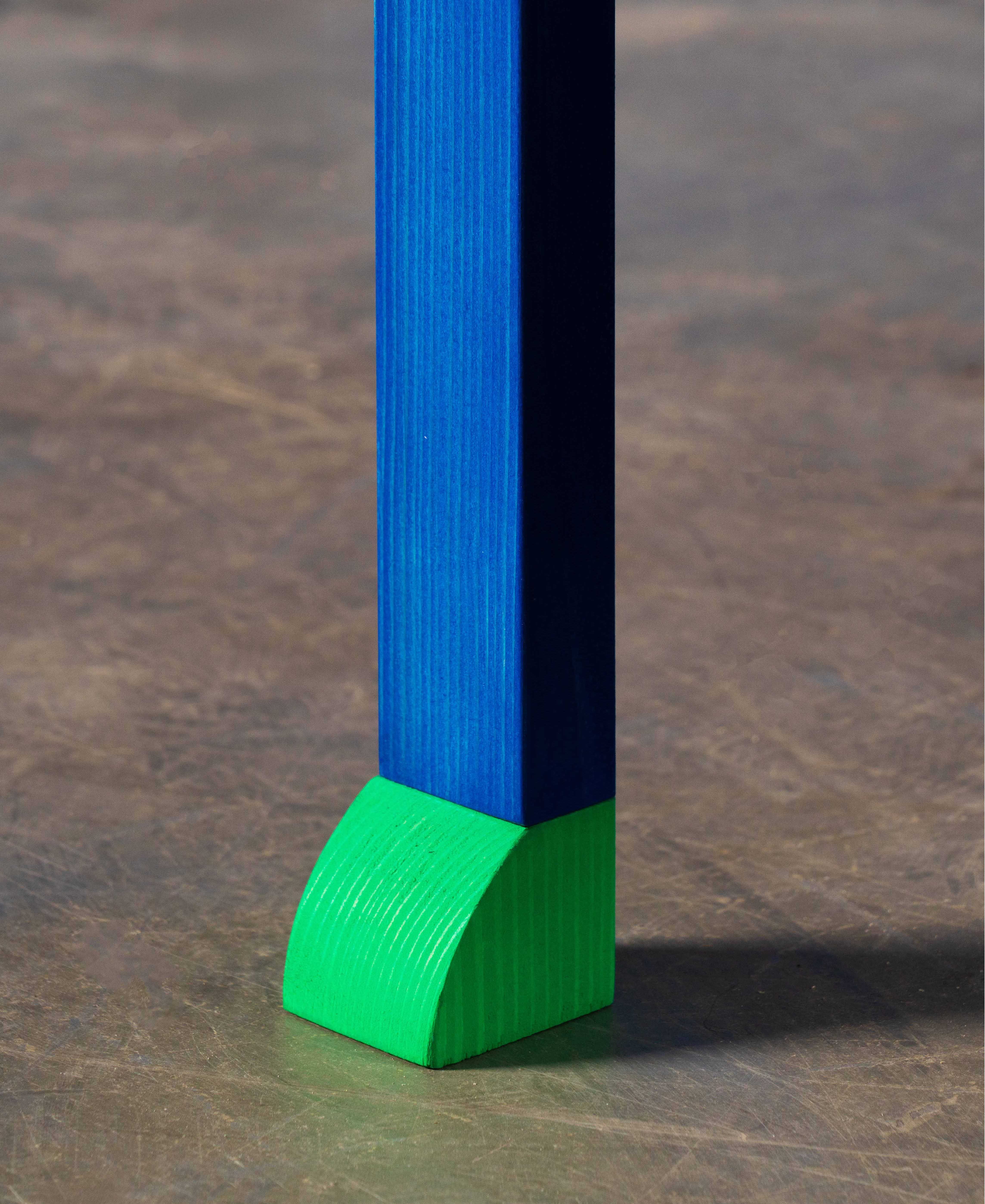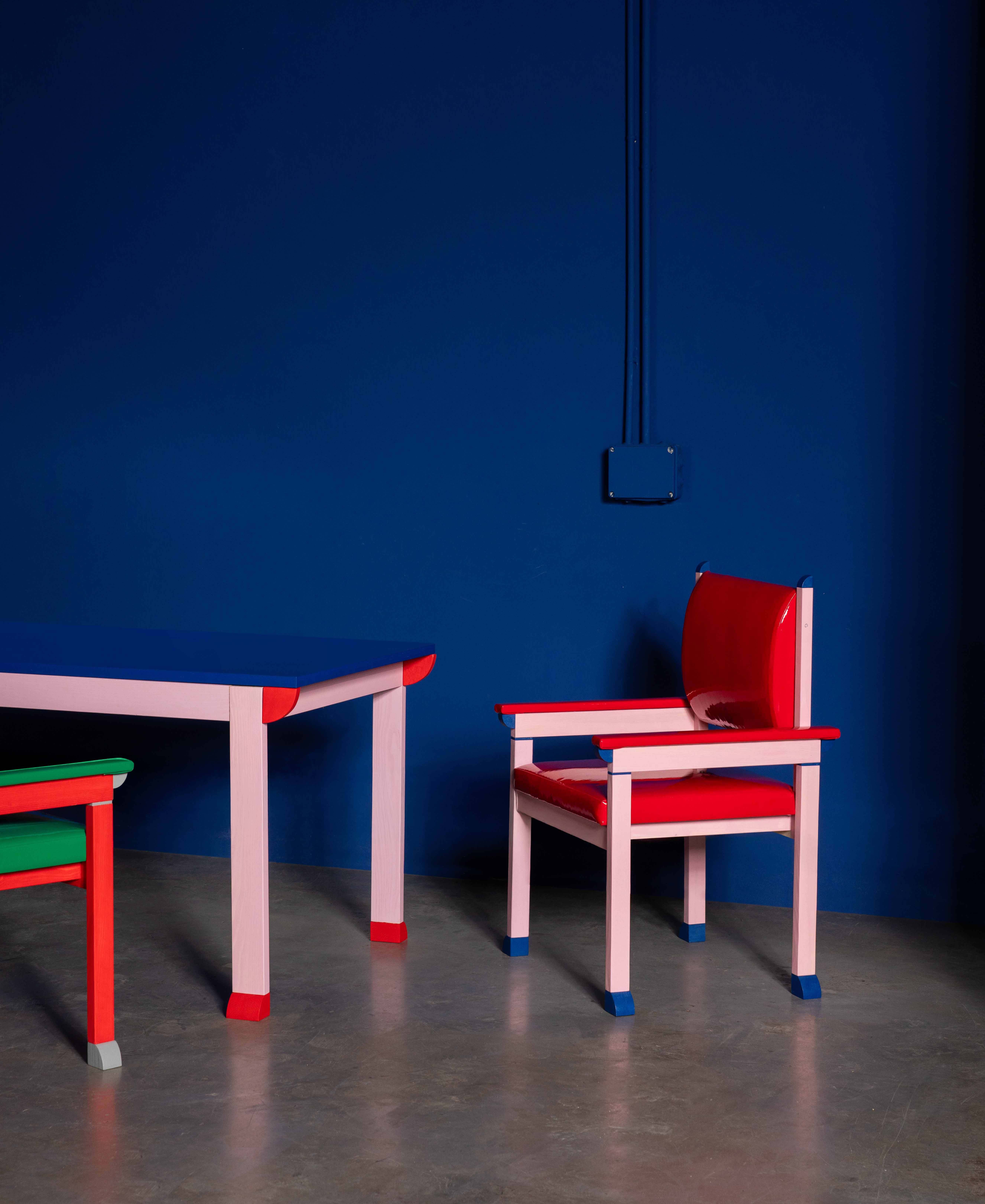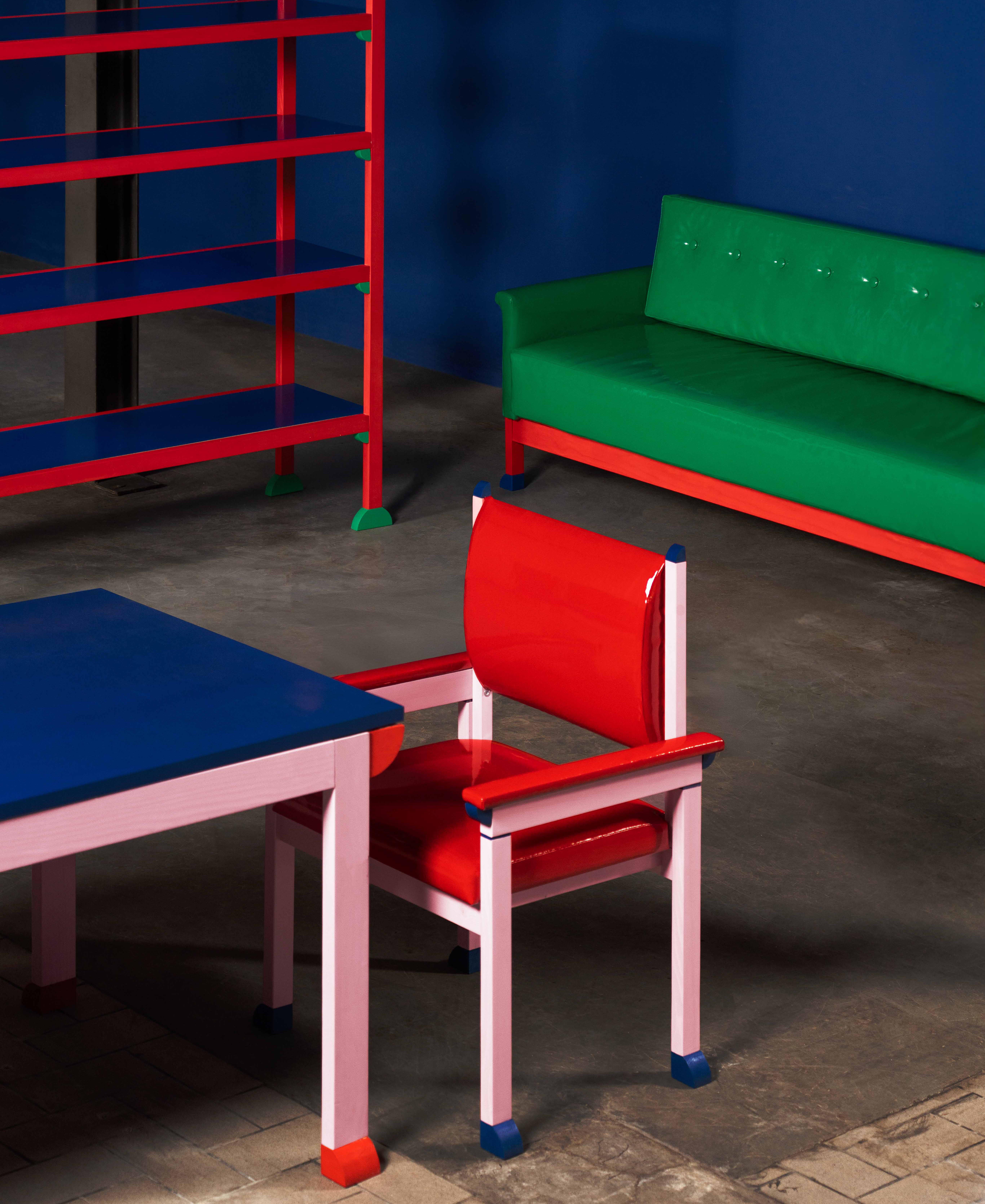 Hand-crafted entirely in wood and hand-finished with water-based paints, the pieces are conceived as friendly domestic companions: grounded objects animated by a graphic decorative system.