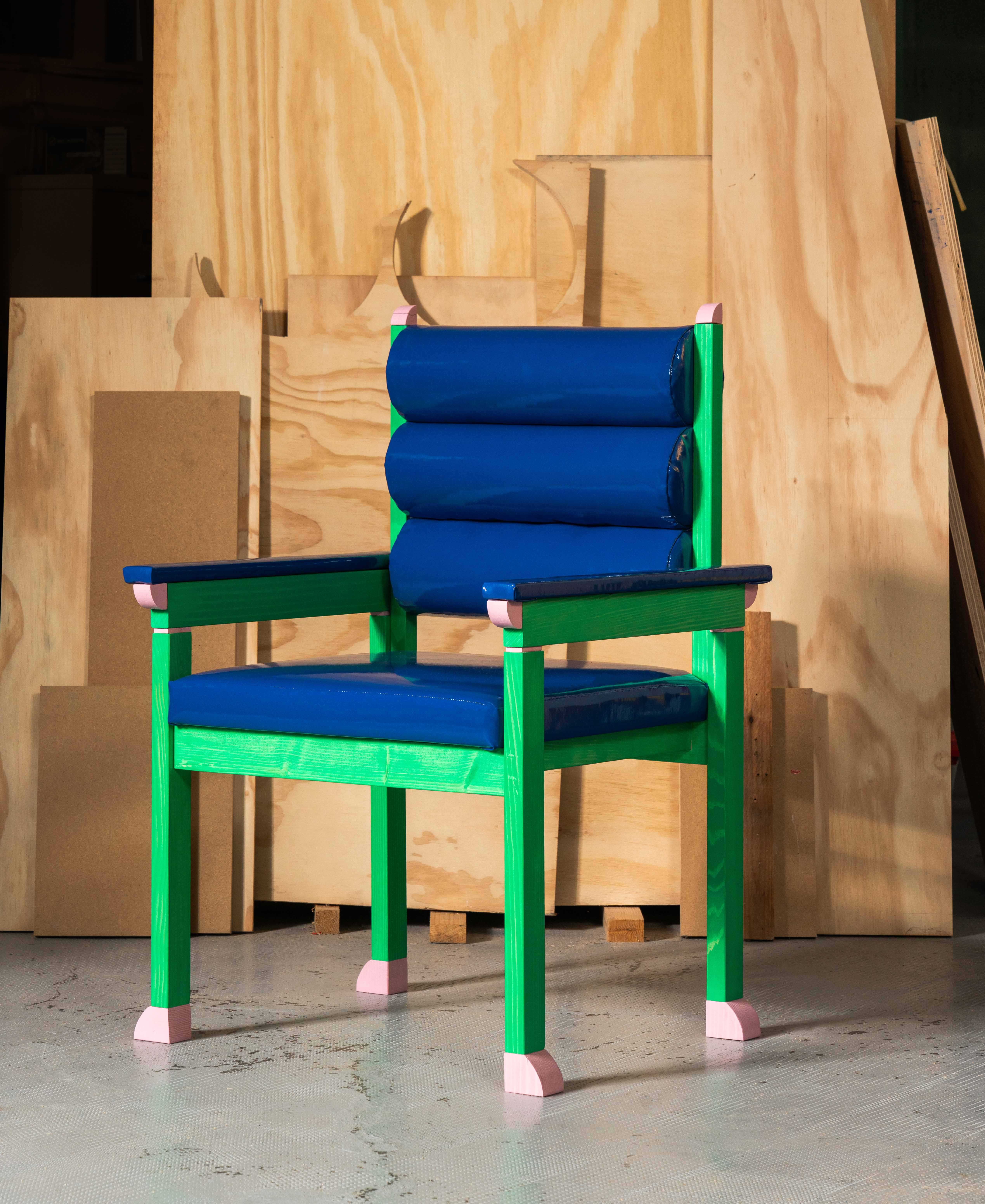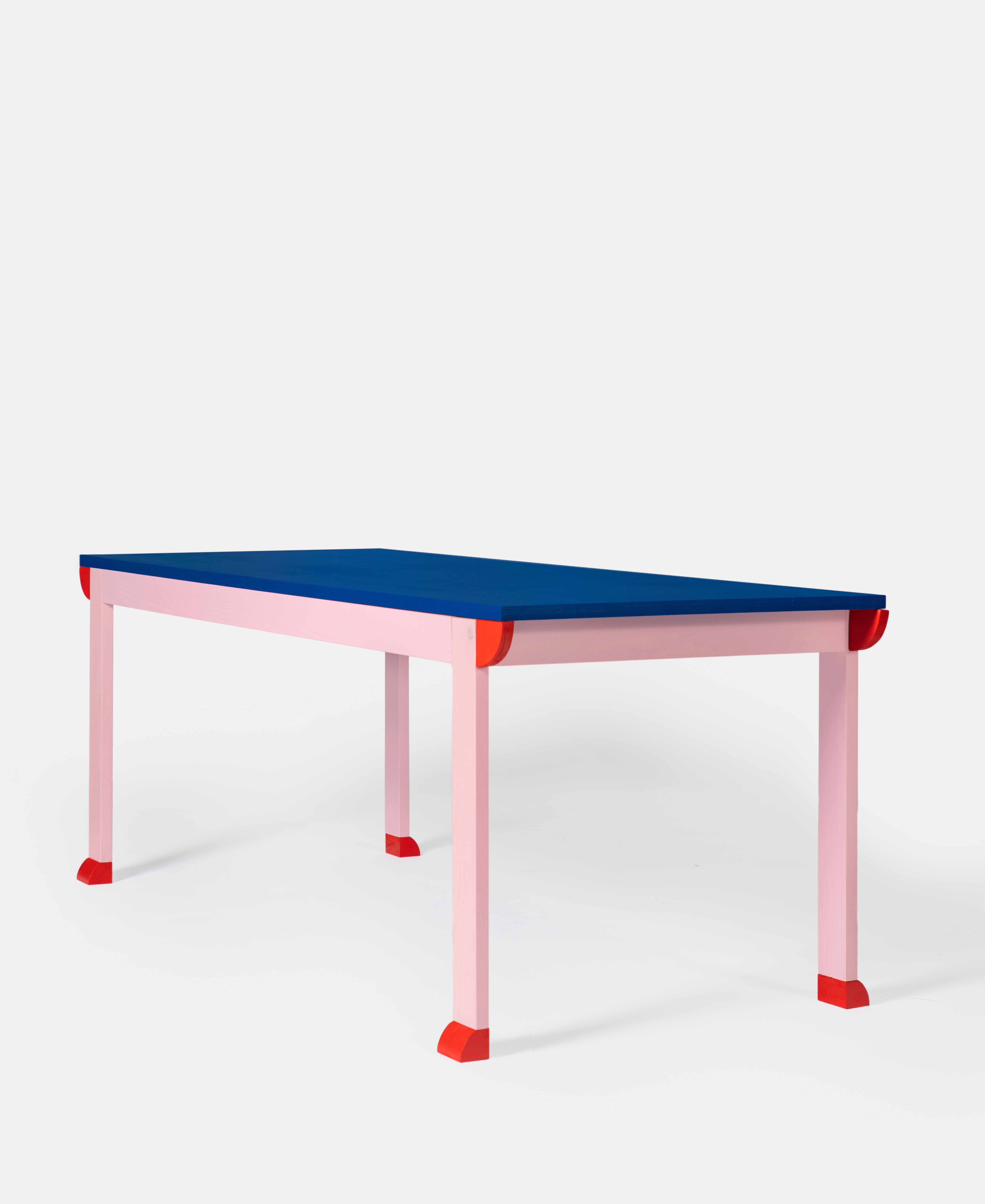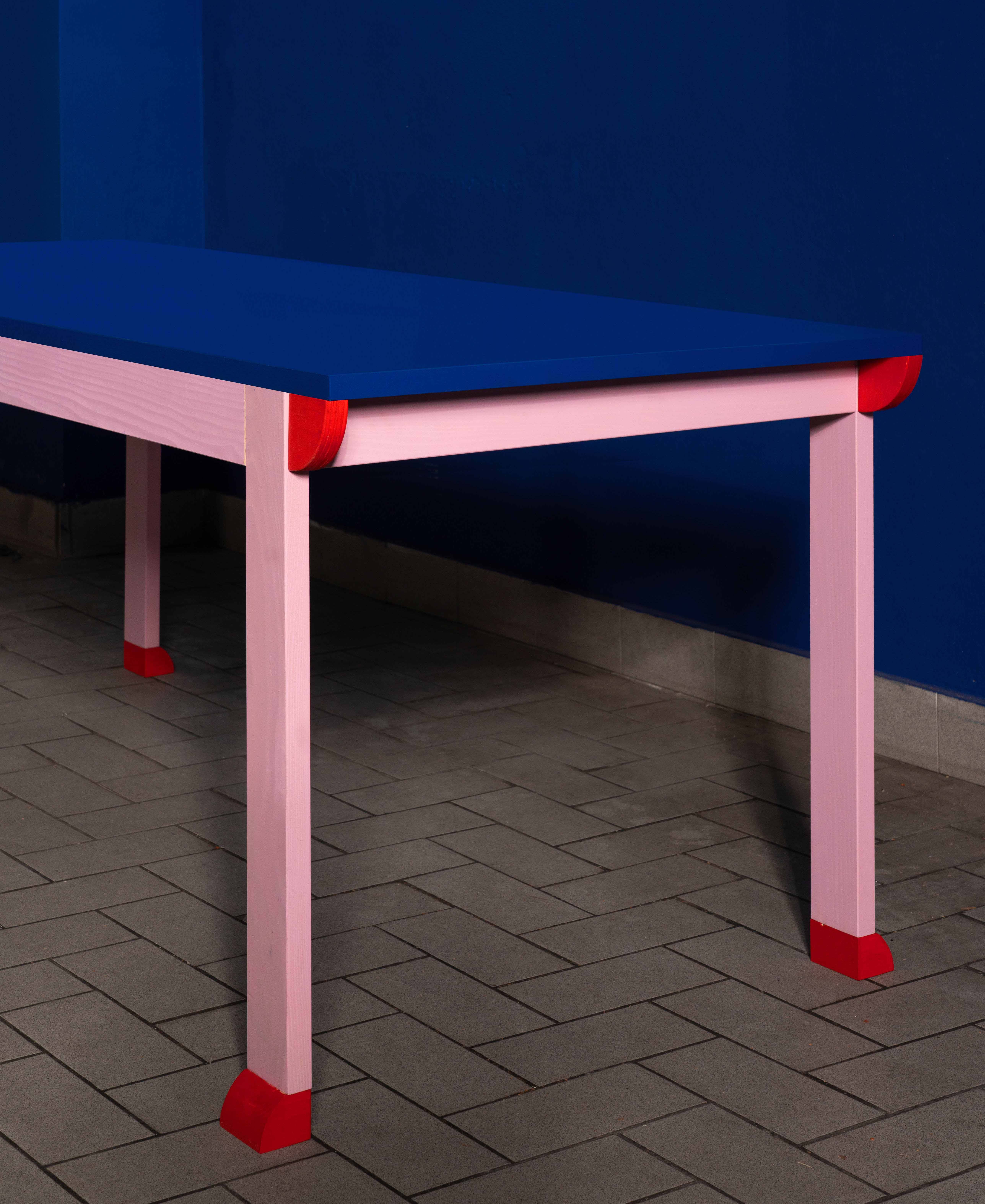 Hand-crafted entirely in wood and hand-finished with water-based paints, the pieces are conceived as friendly domestic companions: grounded objects animated by a graphic decorative system.